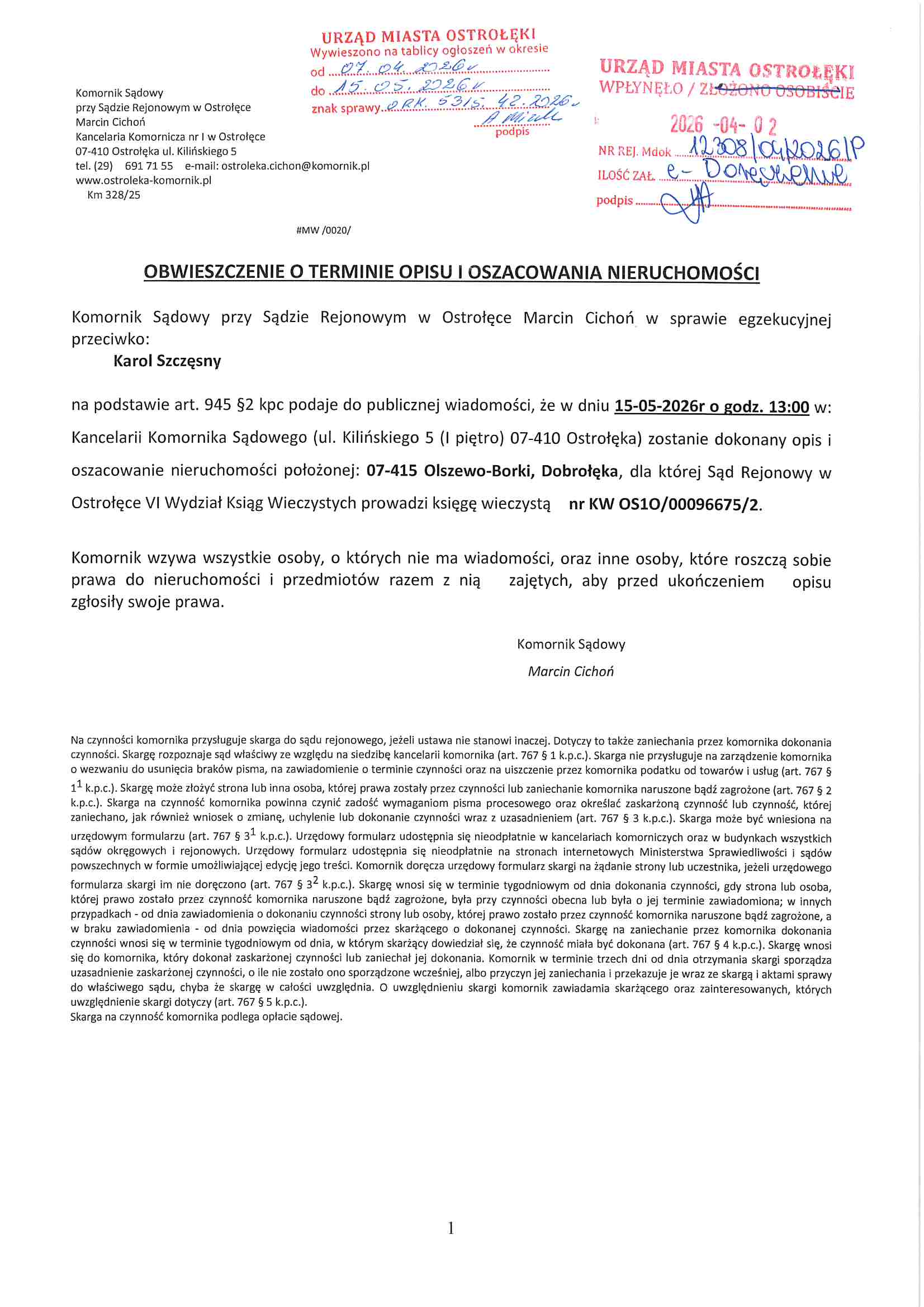 Obwieszczenie o terminie opisu i oszacowania nieruchomości Km 328/25
