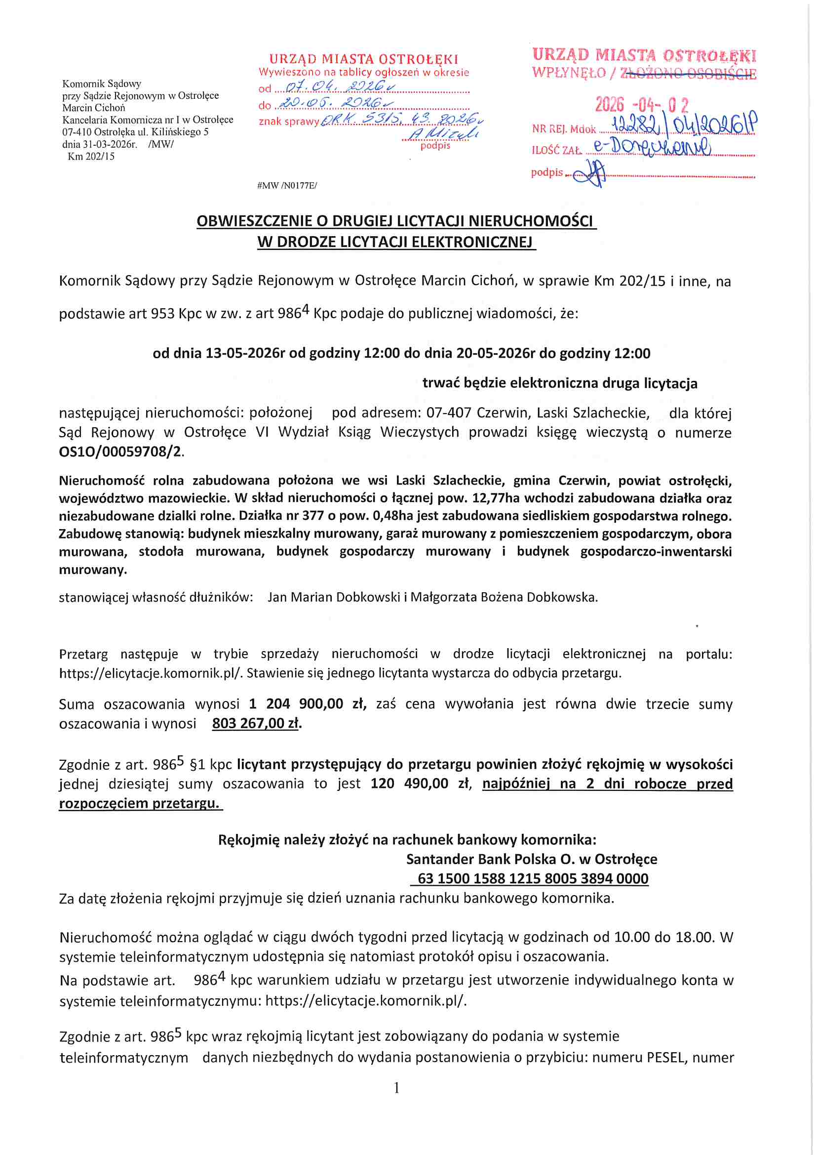 Obwieszczenie o drugiej licytacji nieruchomości w drodze licytacji elektronicznej Km 202/15