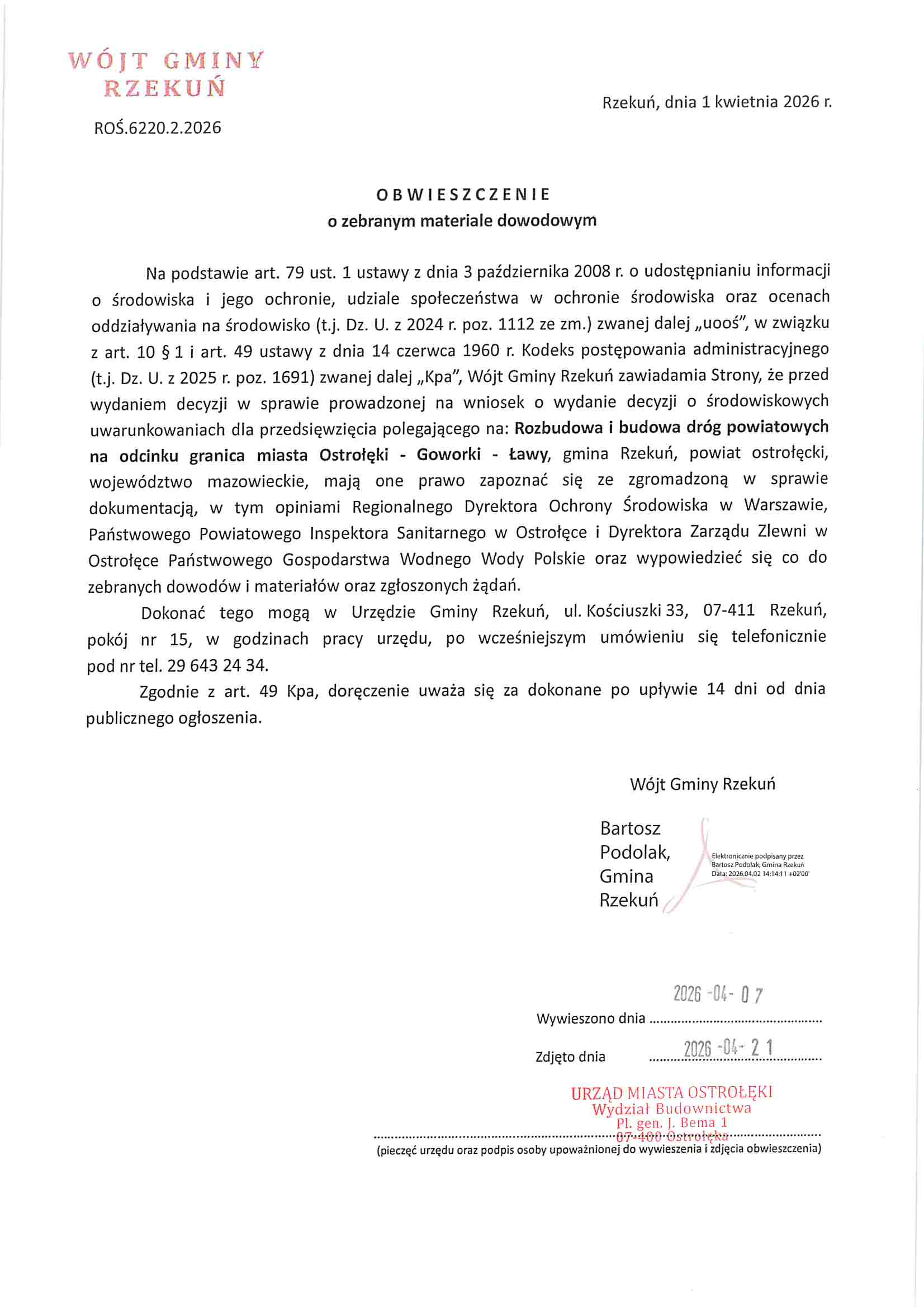 Obwieszczenie Wójta Gminy Rzekuń z dnia 1 kwietnia 2026r., znak: ROŚ.6220.2.2026 o zgromadzeniu materiału dowodowego niezbędnego do wydania decyzji o środowiskowych uwarunkowaniach dla przedsięwzięcia polegającego na: „Rozbudowie i budowie dróg powiatowych na odcinku granica miasta Ostrołęki - Goworki - Ławy".
