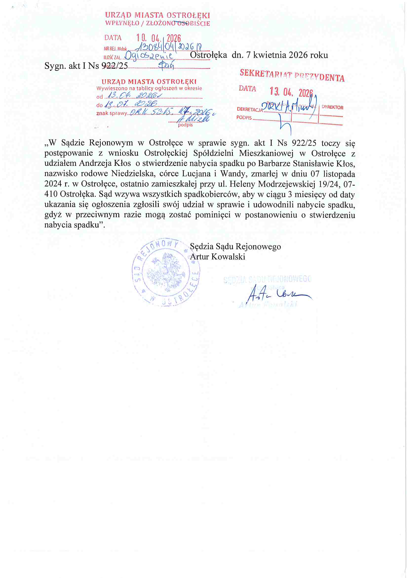 Ogłoszenie Sądu Rejonowego I Wydział Cywilny sygn. akt I Ns 922/25